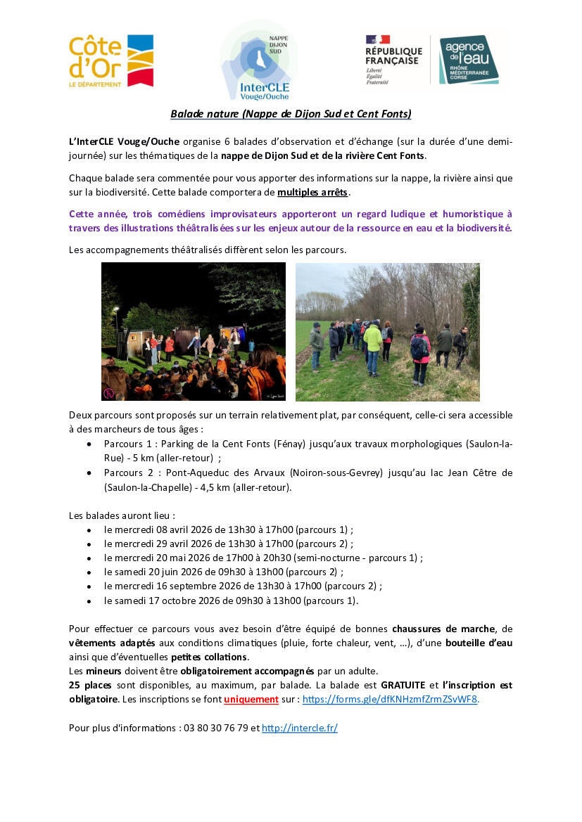 🚶L’InterCLE Vouge/Ouche organise 6 balades d’observation et d’échange (sur la durée d’une demi-journée) sur les thématiques de la nappe de Dijon Sud et de la rivière Cent Fonts.