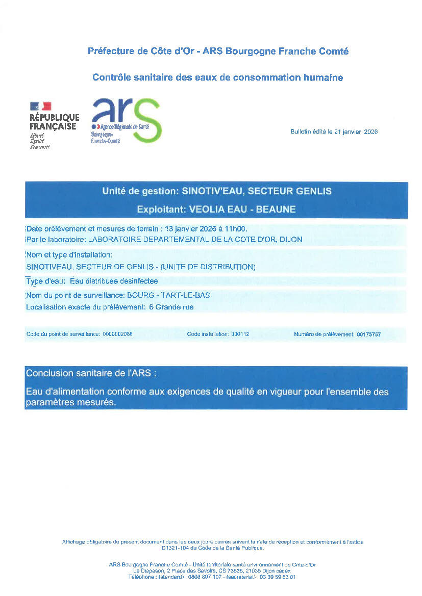Contrôle sanitaire des eaux ARS 23/01/2026 Prélèvement du 13.01.2026 Point de surveillance : TART-LE-BAS Conforme