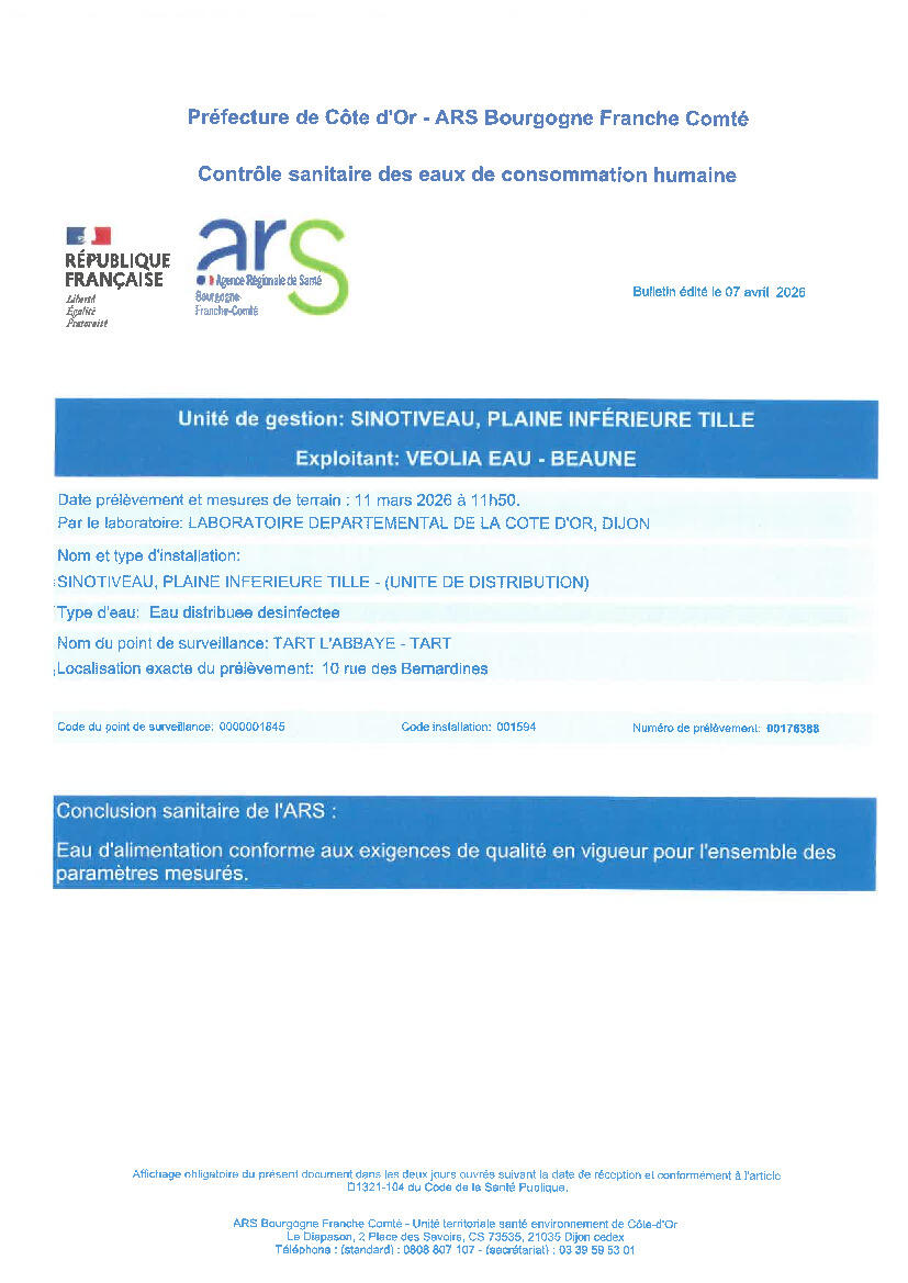 Contrôle sanitaire des eaux ARS 07/04/2026 Vous trouverez ci-joint le contrôle sanitaire des eaux de consommation humaine en date du 11.03.2026