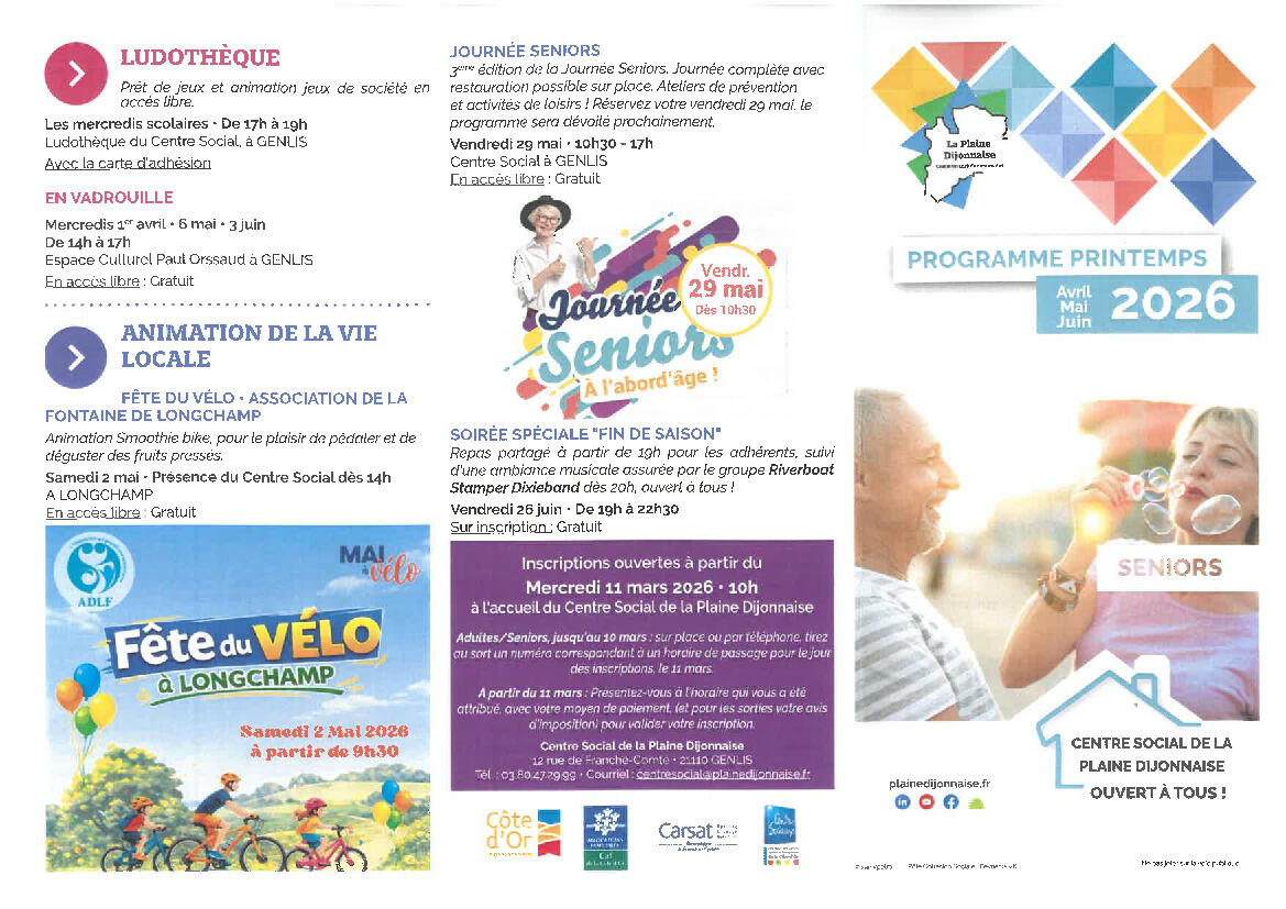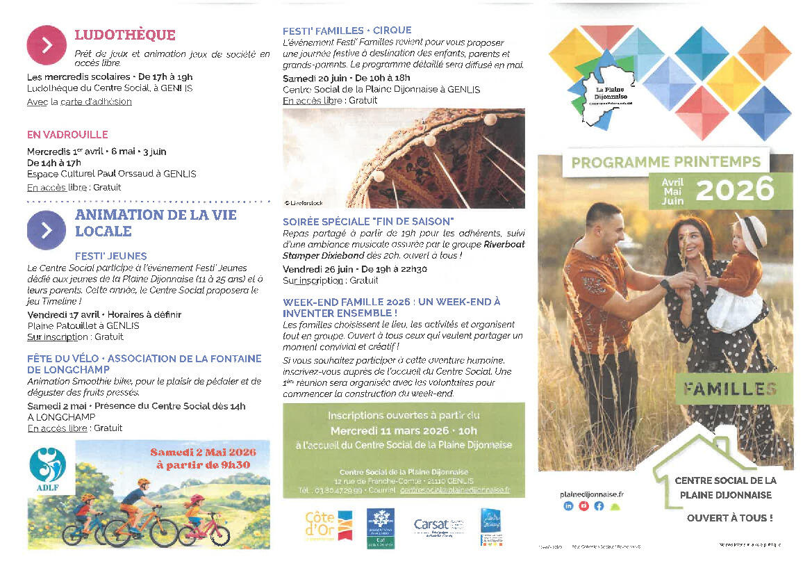 Vous trouverez ci-joint les plaquettes Printemps 2026 du Centre social de la Plaine Dijonnaise :