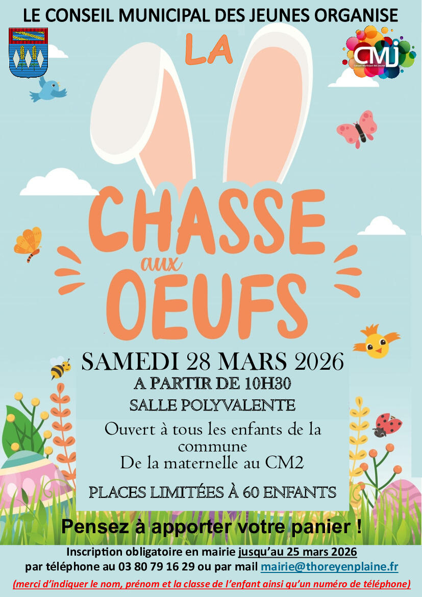 Le Conseil Municipal des Jeunes organise une grande chasse aux Ćufs le samedi 28 mars 2026 Ă partir de 10h30 Ă la salle polyvalente.