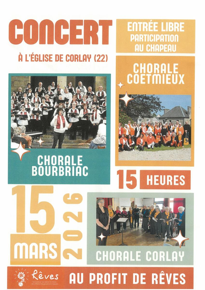 Concert à l'église de CORLAY - 15 Mars à 15H 26/02/2026 Par les chorales de Bourbriac, Coëtmieux et Corlay.