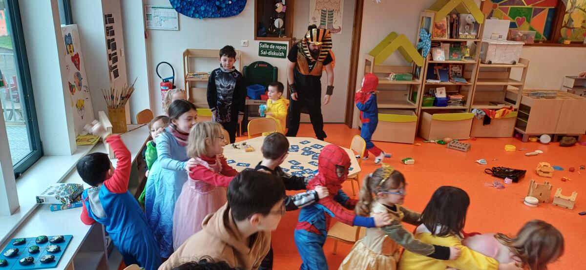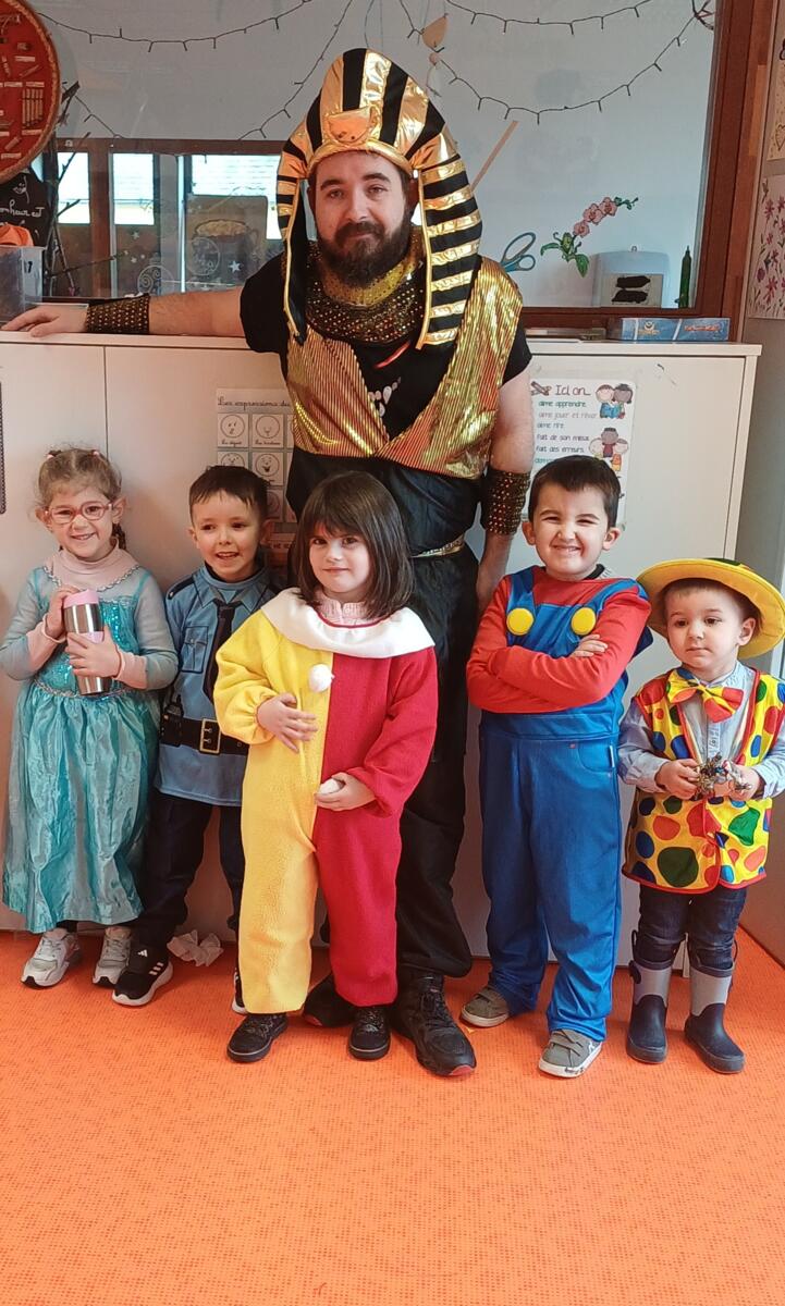 Nos petits carnavaliers habillés avec leurs superbes costumes : princesses, super-héros, animaux rigolos et bien d’autres personnages ! 🎈🎨