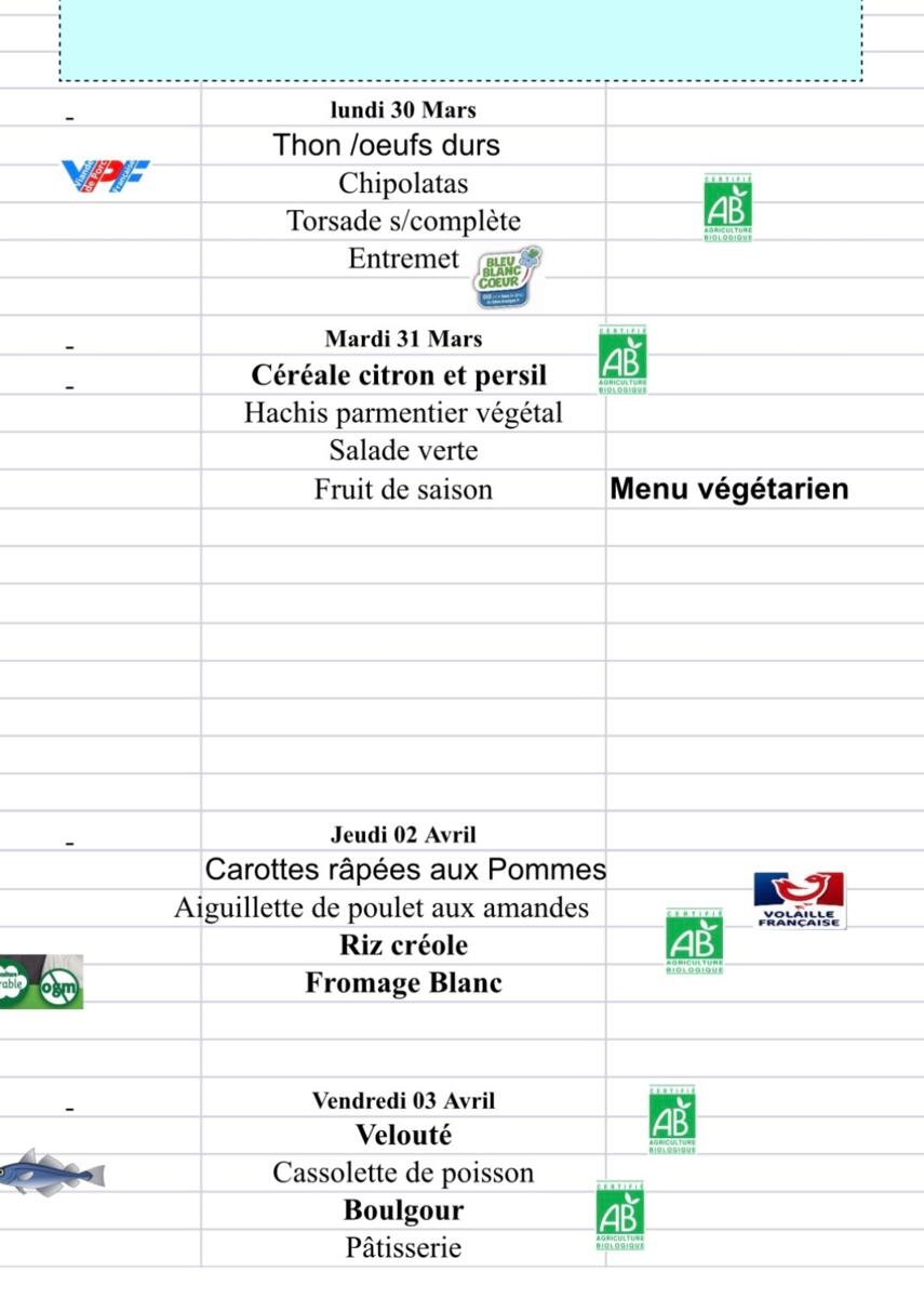 Menus du 30 mars au 3 avril.