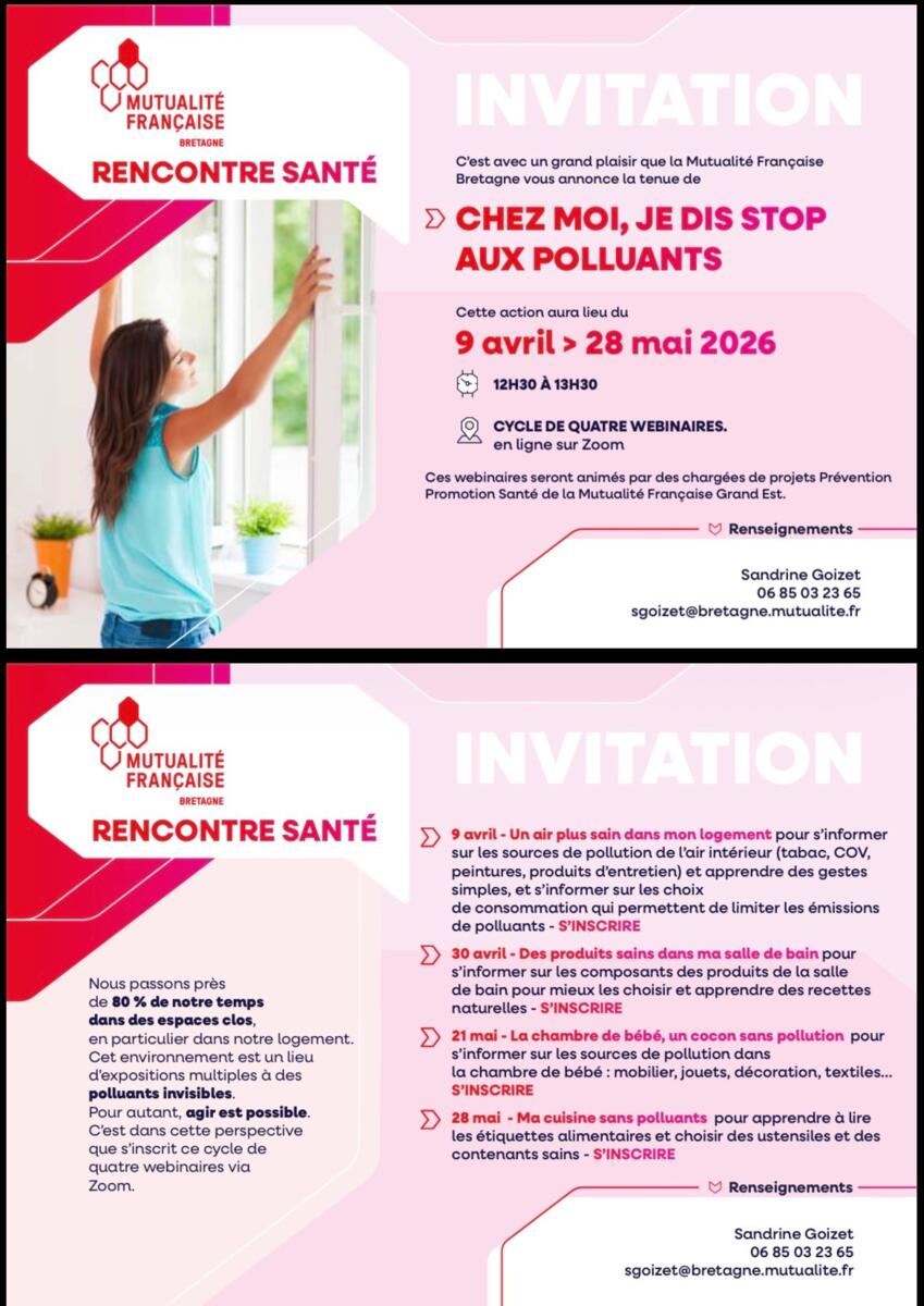 Rencontres santé « Chez moi, je dis non aux polluants » 01/04/2026 Possibilité de s’inscrire à chaque webinaire