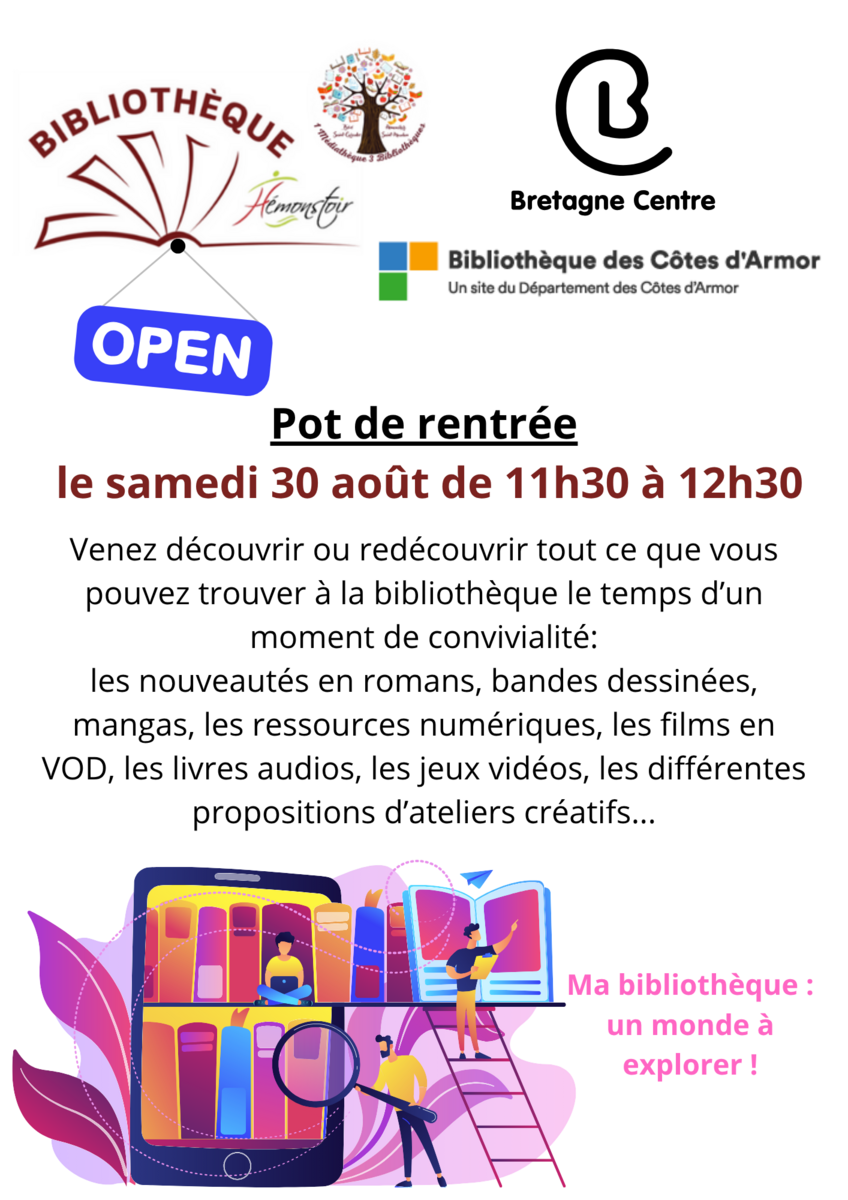 Pour se retrouver et reprendre de bonnes habitudes ou de nouvelles habitudes, Les bibliothécaires, Céline et Esther vous convient à un pot de rentrée ce samedi 30 août à partir de 11H30. C'est l'occasion de découvrir tout ce que peut vous offrir votre bibliothèque: des livres, réserver dans d'autres bibliothèques, des contenus en ligne comme des films, de la musique, des cours de soutien scolaire, des cours sur toutes les choses qui peuvent vous intéresser. Elles vous feront découvrir tout cela dans la bonne humeur, venez nombreuses et nombreux!