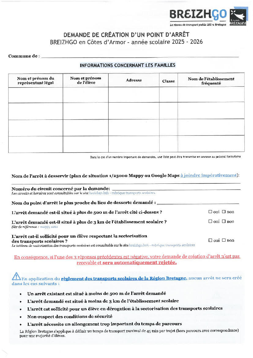 Demandes de création d’un point d’arrêt : Afin d’organiser au mieux la rentrée de septembre 2025, les familles qui souhaiteraient des adaptations de circuits sont invitées à déposer leur demande écrite en Mairie avant le 24 mai accompagnée d'un plan.