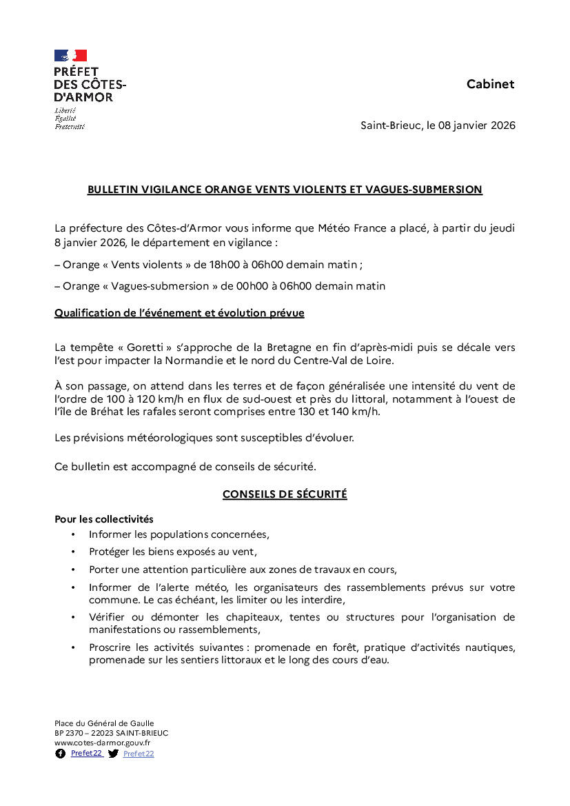 La préfecture des Côtes-d’Armor vous informe que Météo France a placé, à partir du jeudi 8 janvier 2026, le département en vigilance :