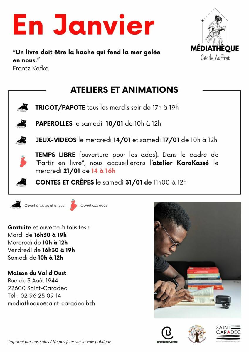 Médiathèque Cécile Auffret 02/01/2026 Les bibliothécaires de Saint-Caradec vous souhaitent une excellente année 2026 🌈! Voici pour vous le programme du mois de janvier.❄ Nous rouvrons nos portes dès aujourd'hui à 16h30, venez faire le plein de lecture!
