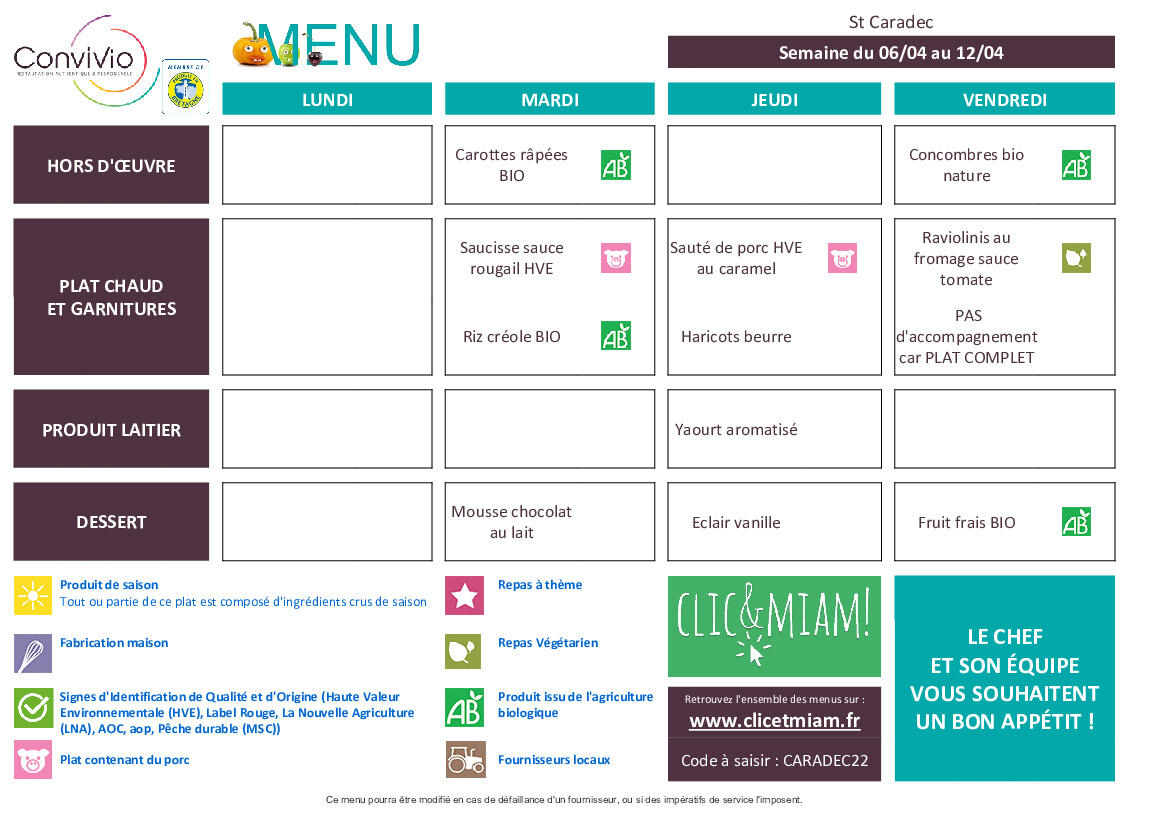 Menu cantine du mardi 7 au vendredi 10 avril.