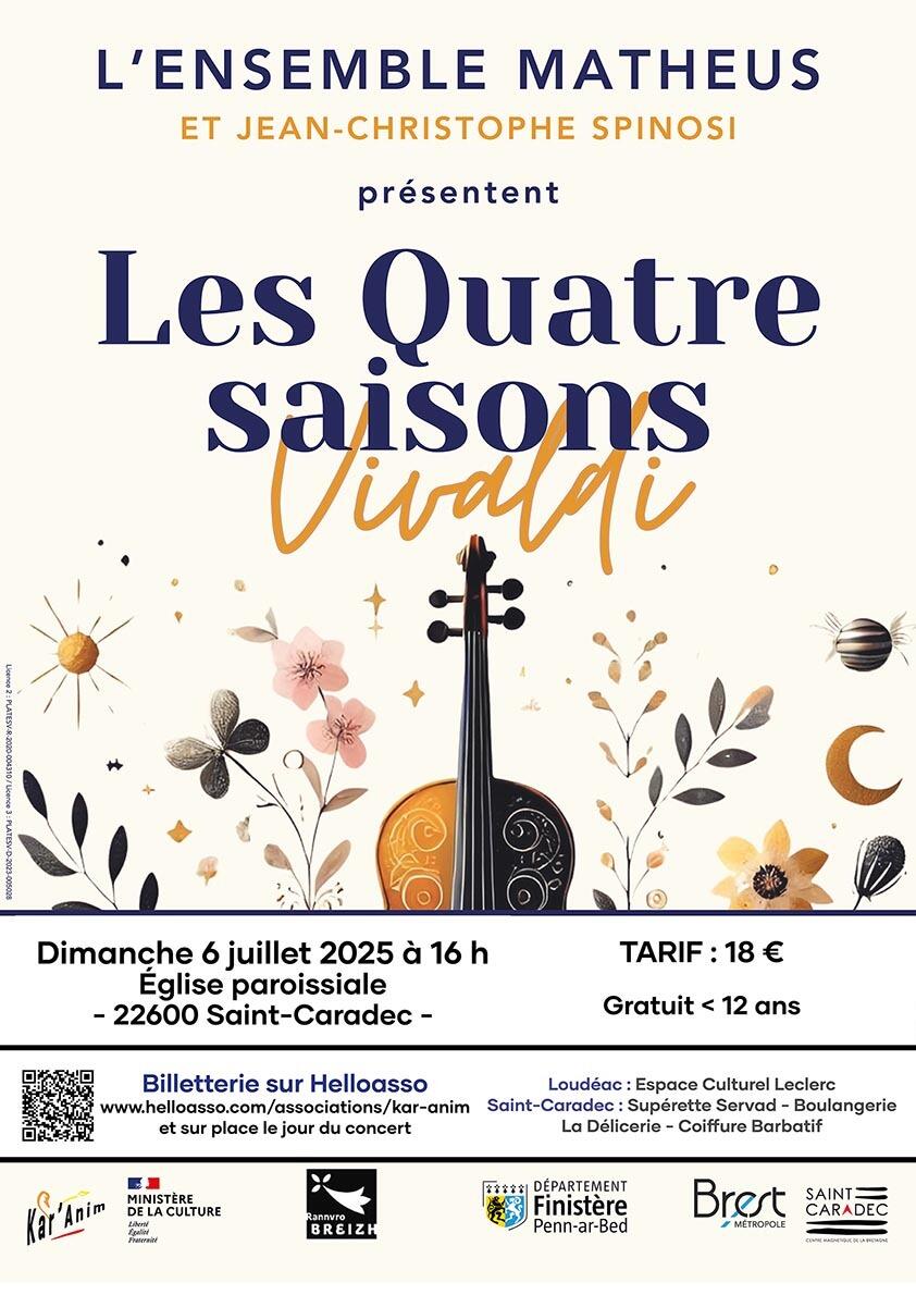 Tarif : 18 € (gratuit moins de 12 ans). Billets en vente dans les commerces de la commune, Espace culturel Leclerc (Loudéac) ou sur Helloasso : https://www.helloasso.com/associations/kar-anim/evenements/ensemble-matheus-les-quatre-saisons-vivaldi.