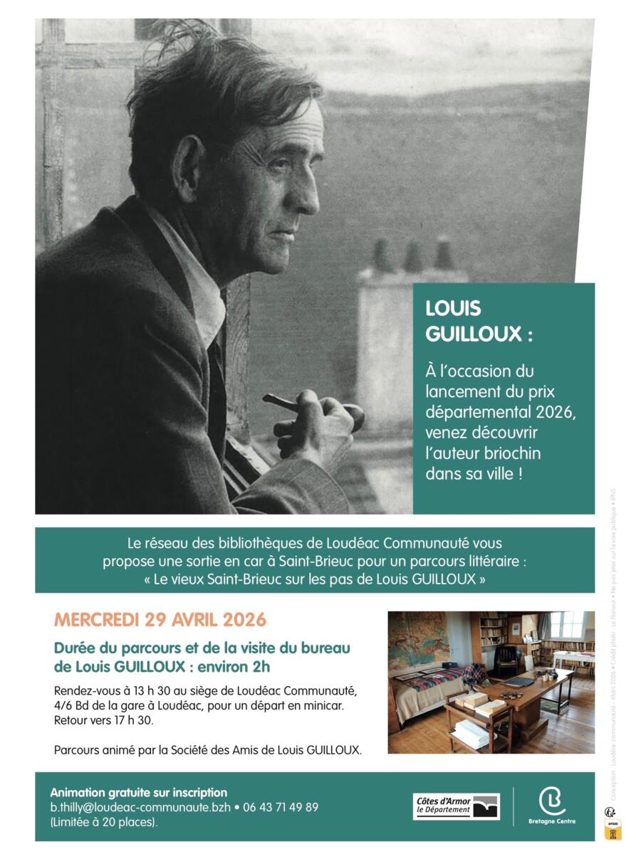 À l'occasion du lancement du Prix départemental Louis Guilloux 2026, le réseau des bibliothèques de Loudéac Communauté - Bretagne Centre, en partenariat avec la Bibliothèque des Côtes d'Armor, vous propose de participer à ce parcours littéraire animé par la Société des Amis de Louis GUILLOUX. Au programme : le vieux Saint-Brieuc et la visite du bureau de l’auteur.