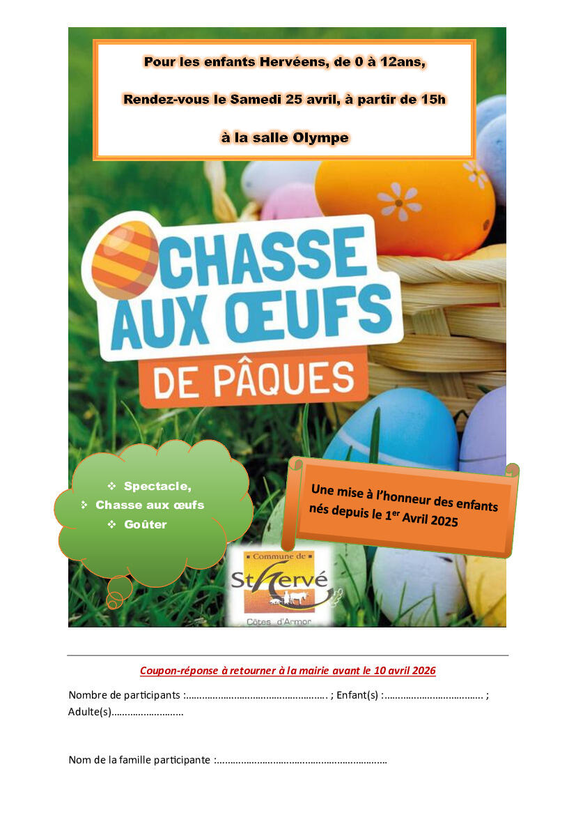 Pour les enfants Hervéens entre 0 et 12ans, une chasse à l’œuf est organisée le Samedi 25 avril.