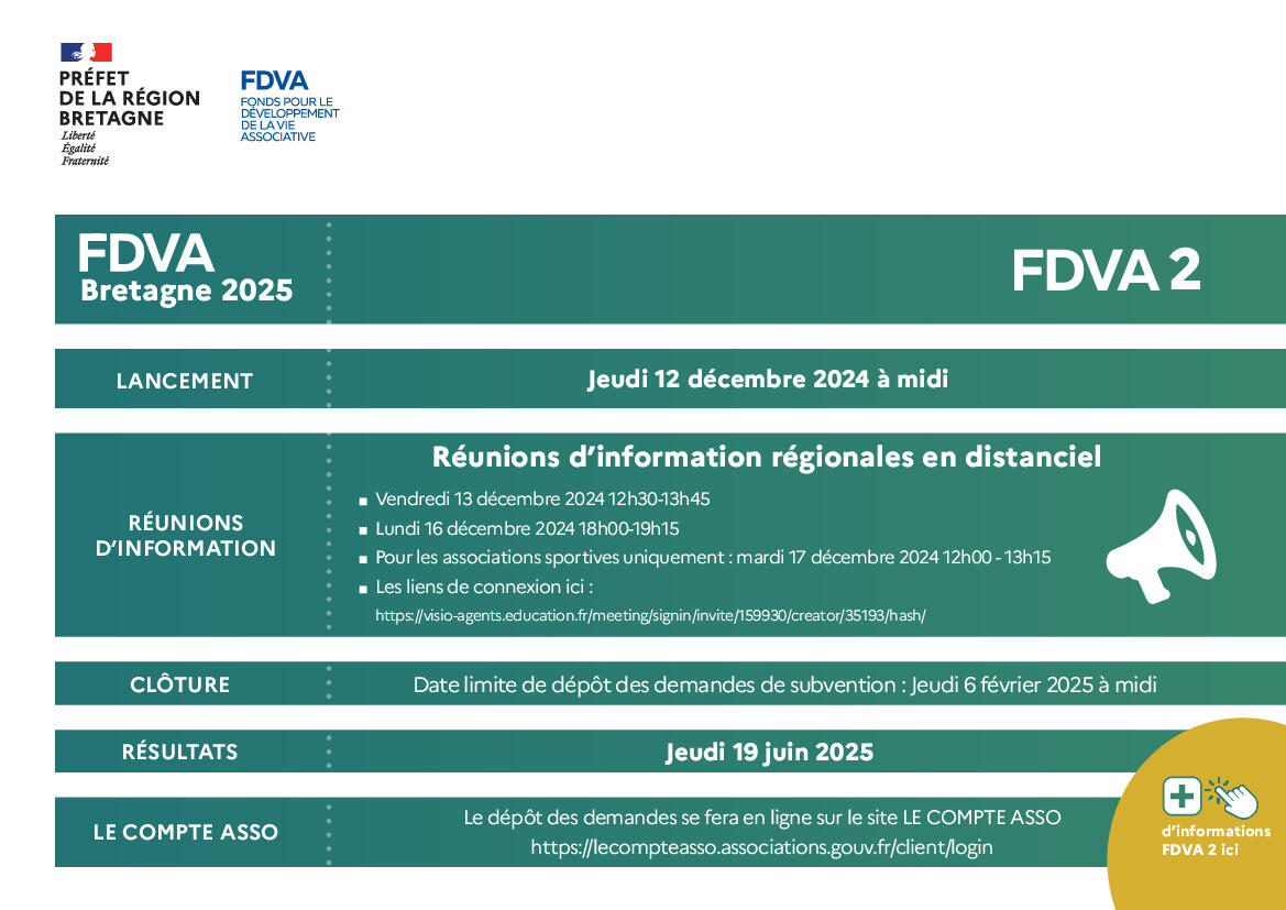 L'appel à projets FDVA2 (fonds pour le développement de la vie associative) sera lancé le jeudi 12 décembre 2024 et clôturé le jeudi 6 février 2025.