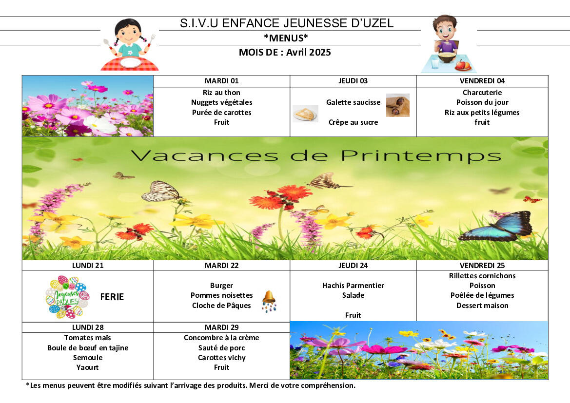 Votre mairie / Actualités / MENU DU MOIS D'AVRIL