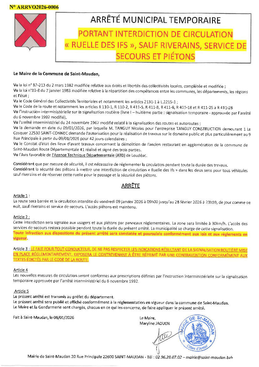 Voici les 3 arrêtés pris dans ce sens par Le Maire de la commune de Saint-Maudan de par son pouvoir de police.