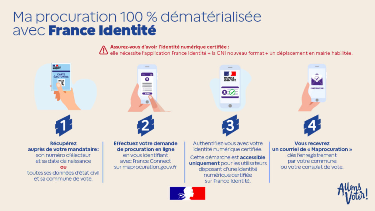 Il est désormais possible, pour l’ensemble des scrutins, d’effectuer sa demande de procuration (ou de résiliation) pour les utilisateurs du portail FranceConnect, de manière totalement dématérialisée. Pour cela, vous devez disposer de la nouvelle carte d’identité et posséder une identité numérique certifiée France Identité.