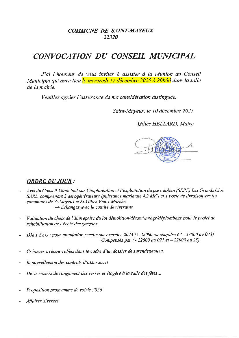J’ai l’honneur de vous inviter à assister à la réunion du Conseil Municipal qui aura lieu le mercredi 17 décembre 2025 à 20h00 dans la salle de la mairie.