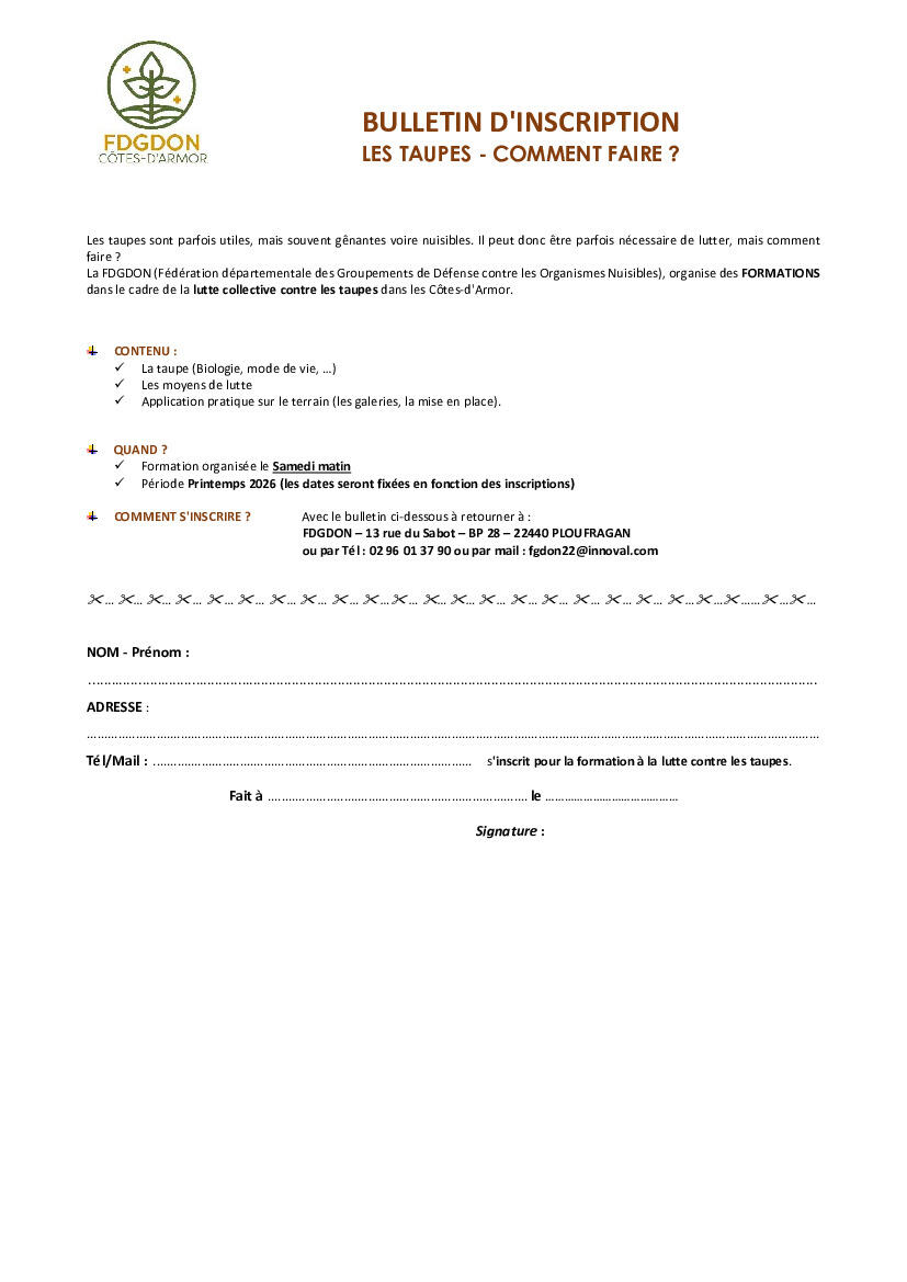 Cette formation est gratuite et s’adresse à tous. Elle a pour objectif d’acquérir les connaissances pour gérer les problématiques de Taupes.