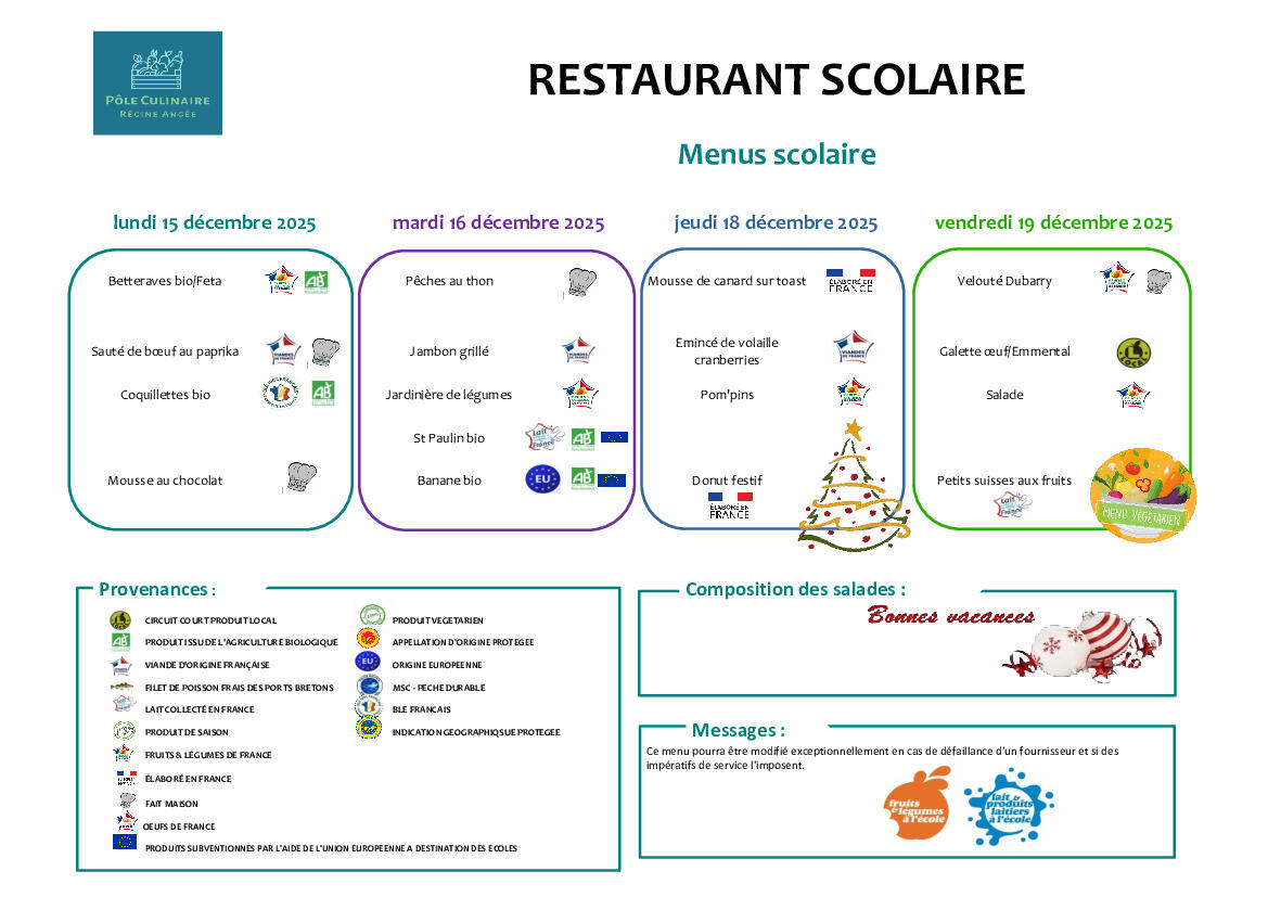 MENU RESTAURANT SCOLAIRE DU 15 AU 19 DÉCEMBRE 2025