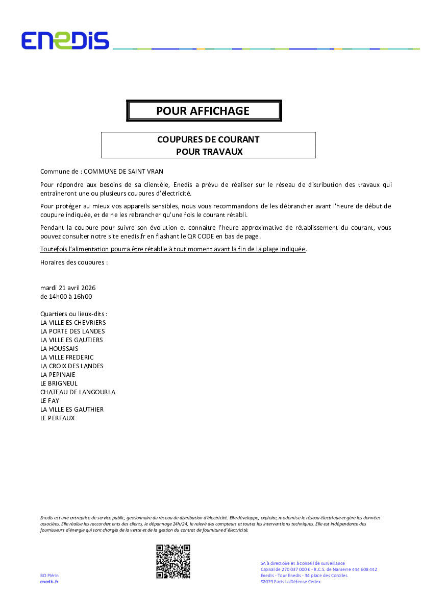 Coupure d'électricité programmée le 21/04/2026