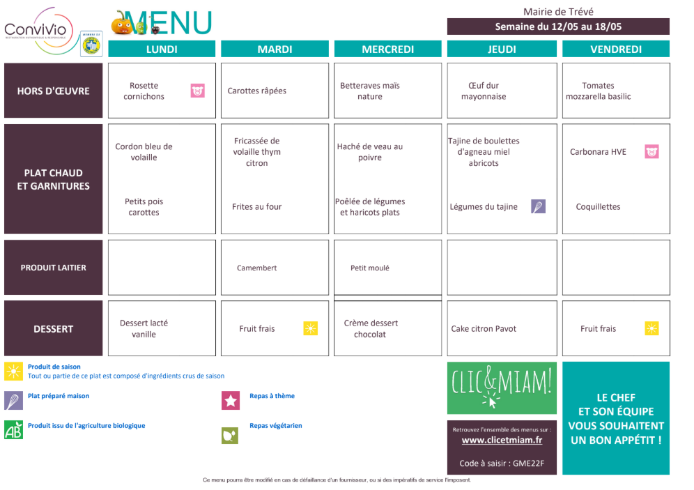 / Menu Cantine Trévé : semaine du 12 au 16 mai