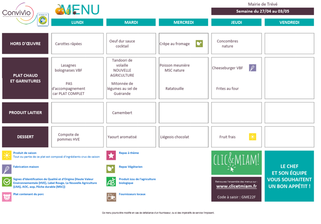 / Menu Cantine Trévé : semaine du 27 au 30 avril