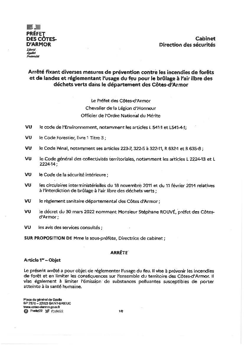 Arrêté préfectoral du 26 Avril 2023 fixant diverses mesures de prévention contre les incendies de forêts et de landes et règlementant l'usage du feu pour le brûlage à l'air libre des déchets verts dans le département des Côtes d'Armor