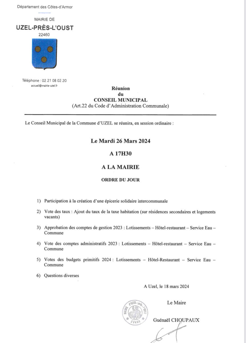Le Conseil Municipal se réunira en session ordinaire le mardi 26 mars à 17h30, salle du Conseil en mairie selon ordre du jour joint.