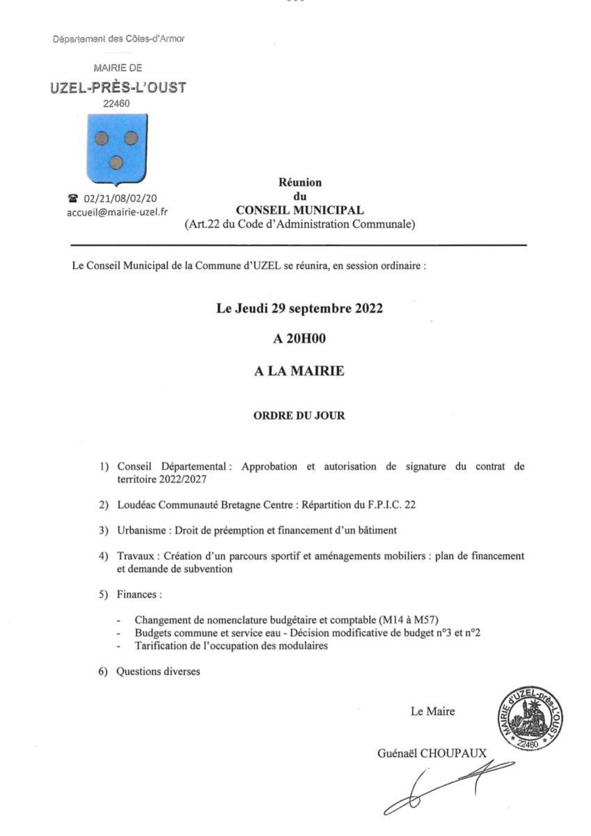 Conseil Municipal - Ordre du jour 28/09/2022 Le Conseil se réunira en session ordinaire le jeudi 29 septembre en salle du conseil à la mairie.