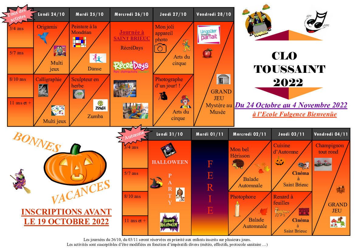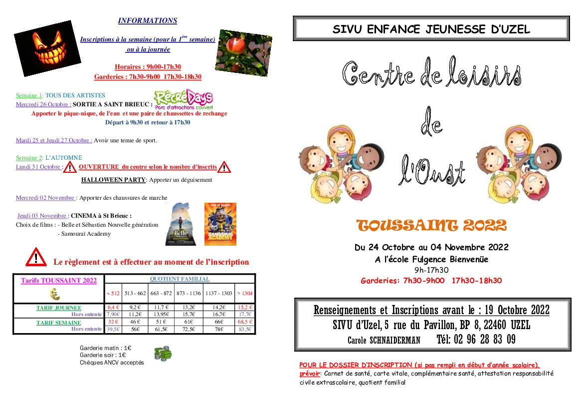 Veuillez trouver ci-joint le programme des vacances de la Toussaint pour le CLO du SIVU d’Uzel ainsi que ses modalités.