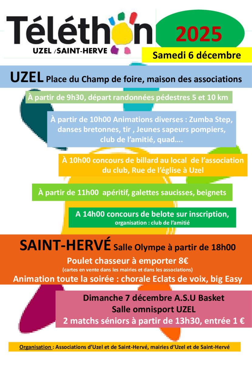 Les municipalités d’Uzel et de Saint-Hervé, ainsi que les associations des 2 communes, seront encore cette année les organisateurs des différentes manifestations du Téléthon qui aura lieu le samedi 6 et le dimanche 7 décembre.