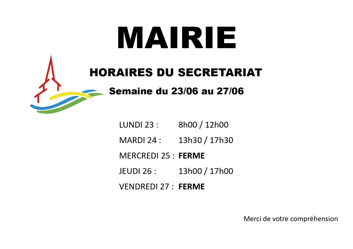 HORAIRES SECRETARIAT 23/06 AU 27/06 20/06/2025 Suite à la formation du personnel, le secrétariat de mairie sera ouvert de la façon suivante