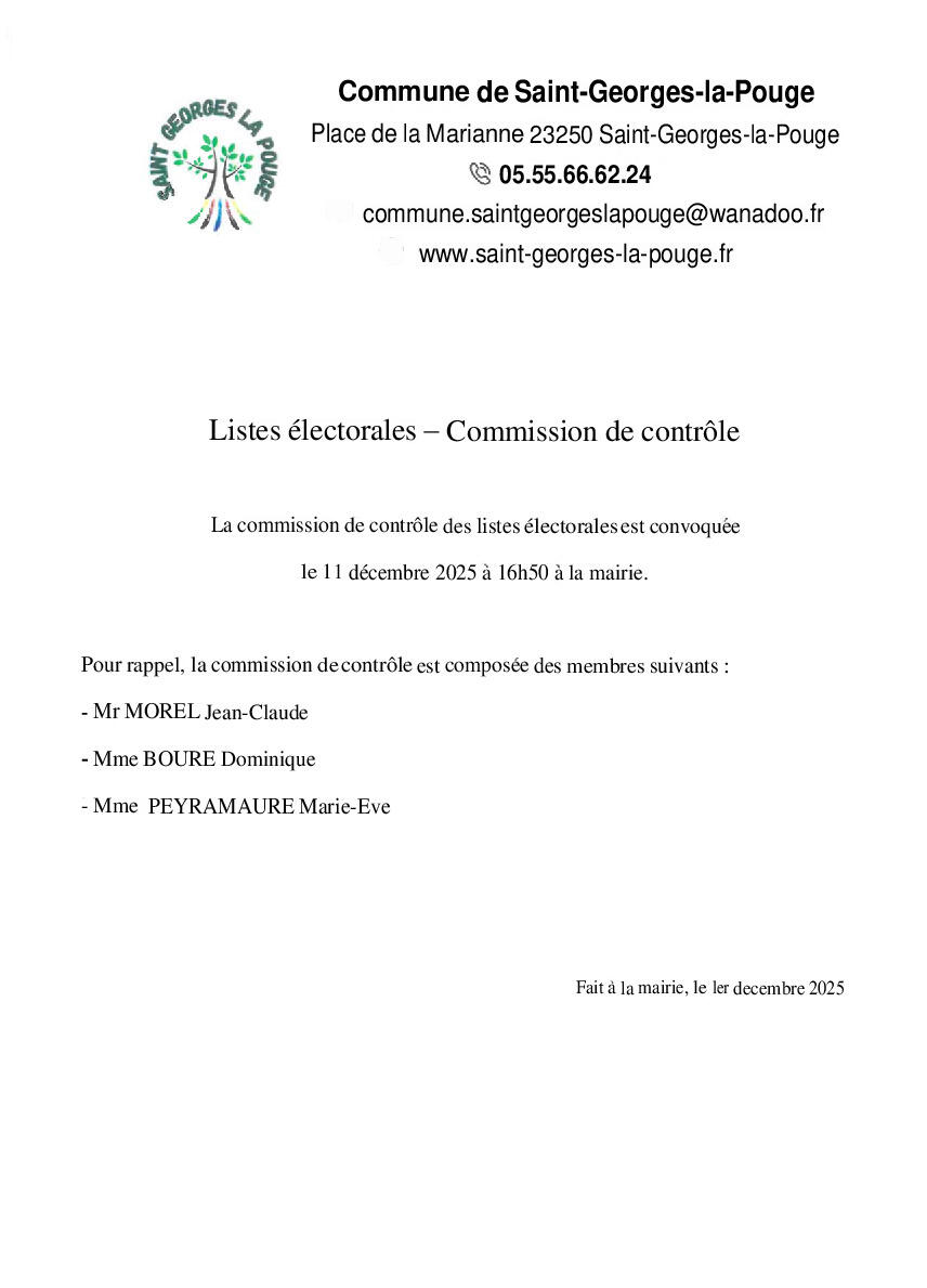 La commission de contrôle des listes électorales se réunira le 11 Décembre 2025 à la Mairie de Saint-Georges-la-Pouge.