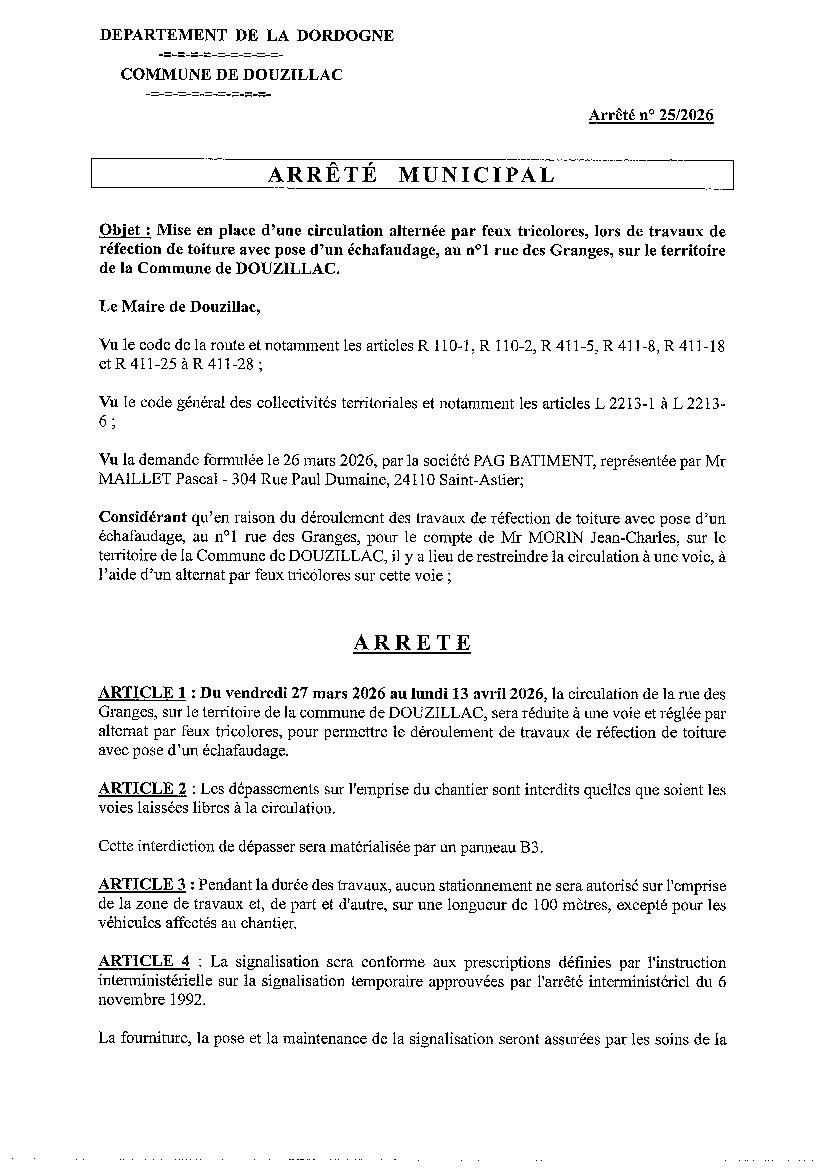 Du vendredi 27 mars au lundi 13 avril 2026 la circulation de la rue des Granges sera réduite à une voie et réglée par des feux tricolores pour permettre le déroulement de travaux de réfection de toiture avec pose d'un échafaudage.