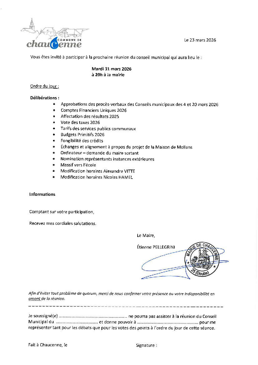 Le prochain conseil municipal aura lieu ce mardi 31 mars à 20h dans la salle du conseil à la mairie.