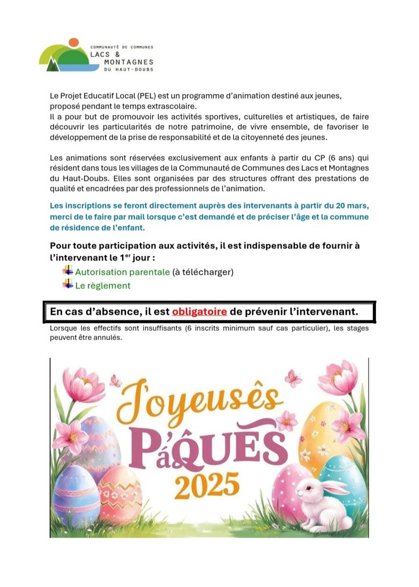 Programme PEL vacances d’avril