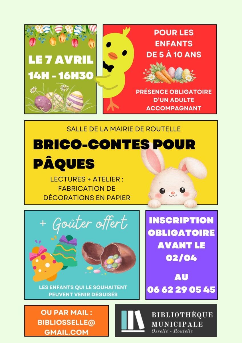 Les bénévoles de la bibliothèque organisent une animation pour Pâques à destination des enfants de 5 à 10 ans. Rendez-vous dans la salle de la mairie déléguée de Routelle le mardi 7 avril de 14h à 16h30. Lecture de contes, atelier de bricolage et goûter offert. Sur inscription avant le 2 avril au 06.62.29.05.45. Les enfants doivent être accompagnés d'un adulte.