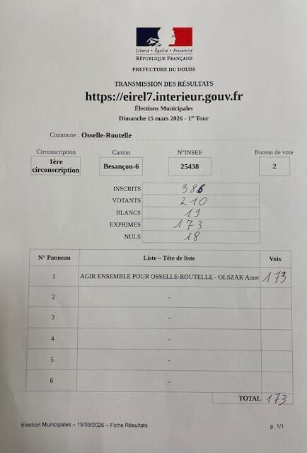 La liste "Agir ensemble pour Osselle-Routelle" est élue avec 84,55 %