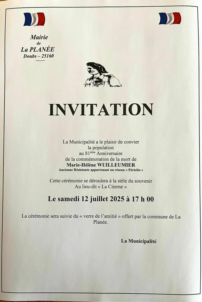 Invitation commémoration Marie Hélène Wuilleumier 13/06/2025 Nous vous attendons nombreux le samedi 12 juillet prochain à 17h