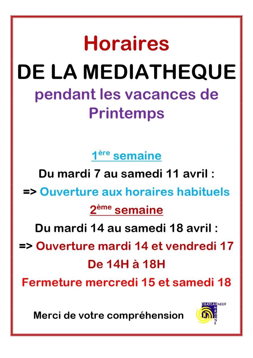 Votre mairie / Actualités / Horaires de la médiathèque – Vacances de Printemps