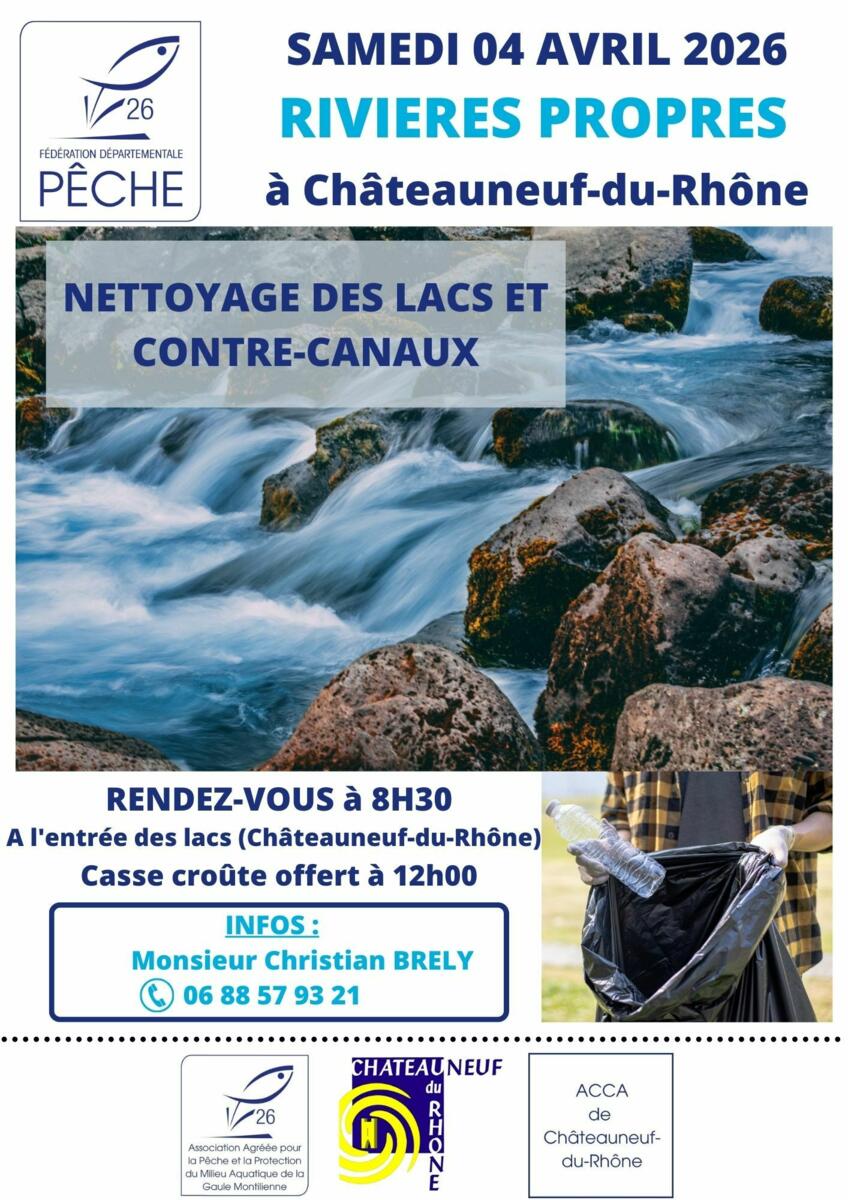 La Fédération Départementale de la Pêche de la Drôme et l’AAPPMA La Gaule Montilienne, en partenariat avec la commune de Châteauneuf-du-Rhône et l’ACCA locale, organisent une opération de nettoyage des lacs et contre-canaux dans le cadre de l’opération nationale Rivières Propres.