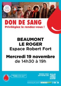 La collecte de sang est de retour à Beaumont le Roger le mercredi 19 novembre 2025 de 14h30 à 19h00 en l’espace Robert Fort.