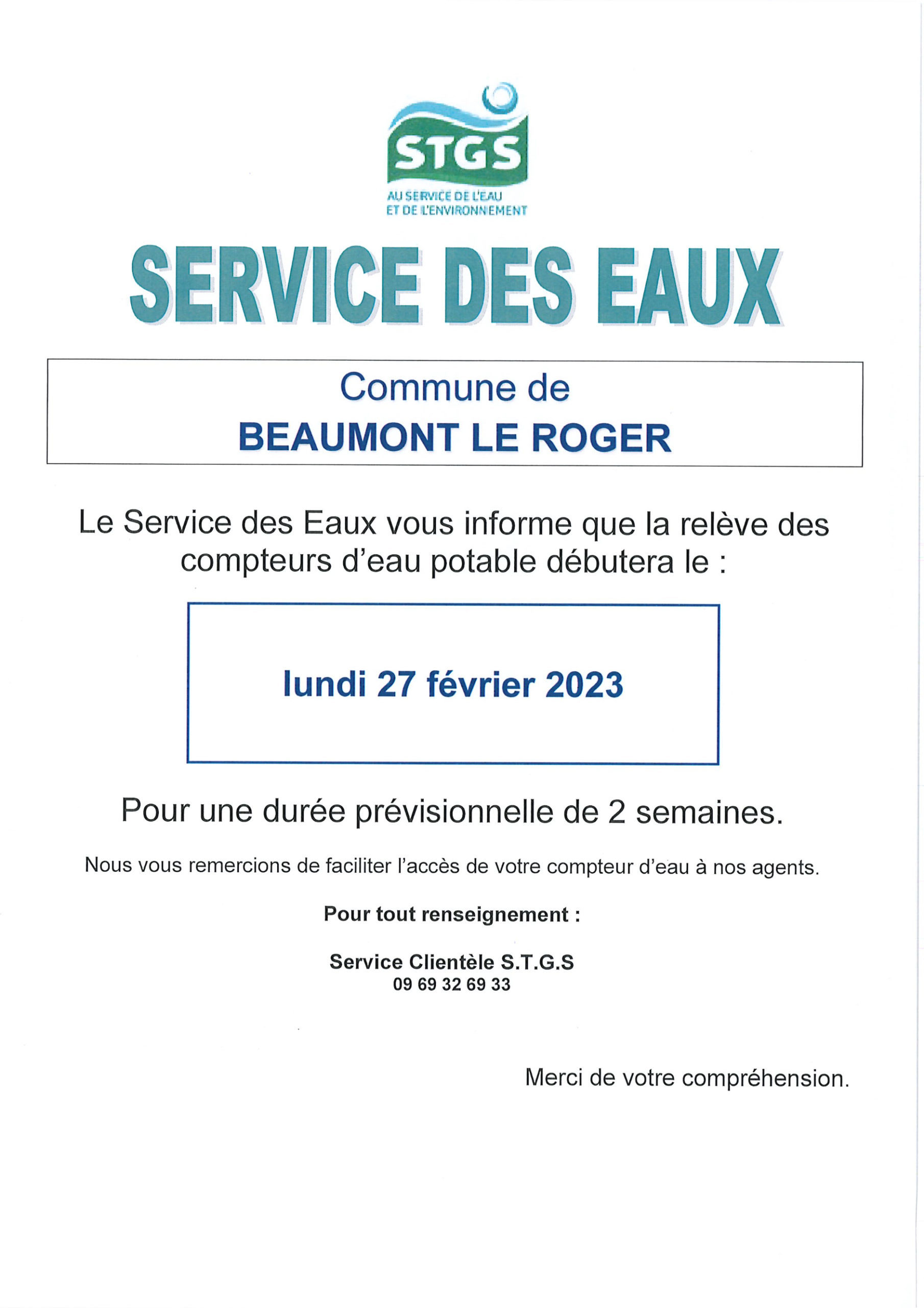 L’article Relève des compteurs d’eau à partir du lundi 27 février est apparu en premier sur Mairie de Beaumont Le Roger.