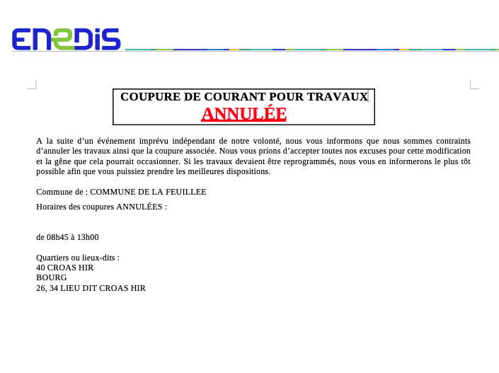 Annulation de la coupure de courant pour travaux.