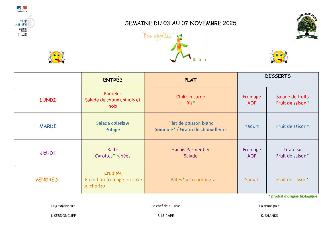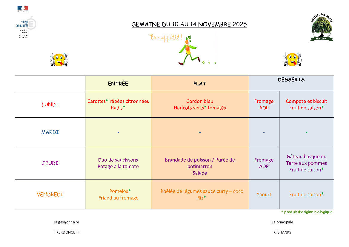Menu cantine École / Collège du 17 au 21 novembre 2025