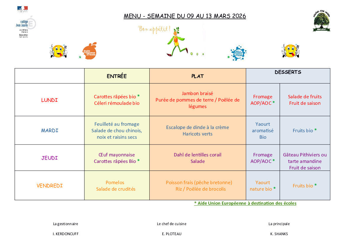 Menu cantine École / Collège du 09 au 13 mars 2026