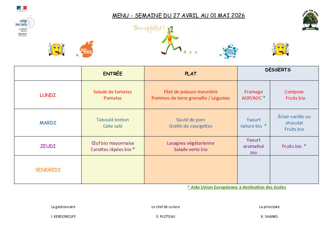 Menu cantine école/collège du 27 avril au 01 mai 2026