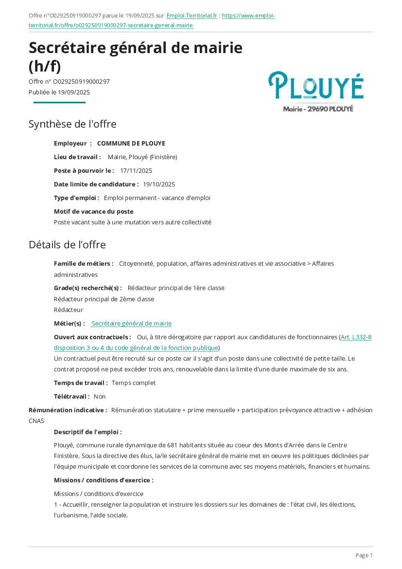 RECRUTEMENT Secrétaire général(e) de Mairie