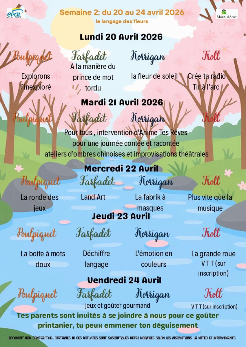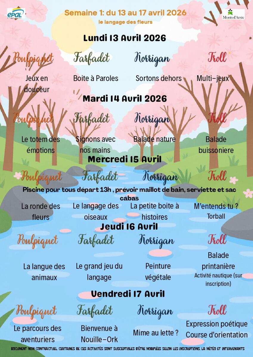 Accueil de loisirs printemps 2026 30/03/2026 Voici le programme des vacances de printemps 2026 de l’Accueil de loisirs du Yeun Elez.